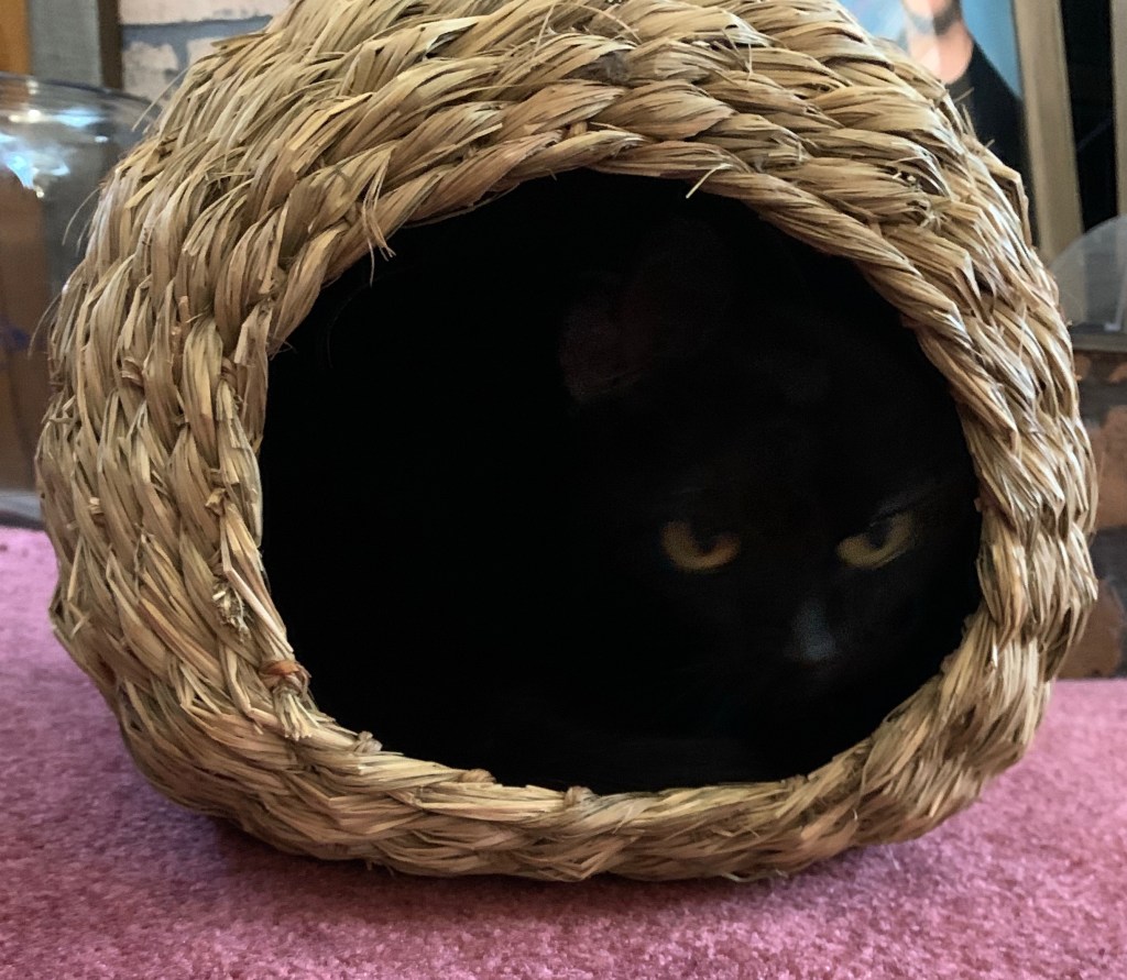 My daughter and I brought Jinx home from the vet in her favorite basket. It’s small, but she loves to snuggle herself into it. Thank goodness for those gorgeous eyes! It’s hard to find her when she’s hiding. She’s a night owl, staying up all night and demanding attention, then sleeping the day away in her basket or cuddled on/under her favorite blanket.