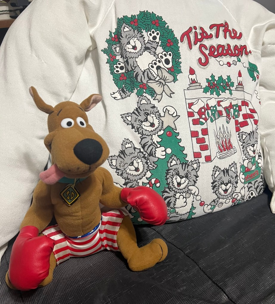 For three of the last five months of her life, mom found herself going to wound care to manage the awful bedsores that developed on her heels and backside after she “busted her ball” and had a partial hip replacement. At one particularly painful appointment, they gave her a Scooby Doo stuffed animal to hold onto. This wasn’t just any Scooby. This one was dressed in boxing shorts and gloves with his tongue sticking out the side of his mouth. Mom took a particular liking to this Scooby, so much so that she told my sister she was gonna take him home! Now if my sister or I had said such a thing, mom would’ve told us that it wasn’t ours to take, so my sister told her she’d have to leave Scooby for the next patient that needed him. My sister scoured the internet and found the boxing Scooby and ordered it as a Christmas present for my mom. As fate would have it, mom ended up back on the hospital before Christmas. It wasn’t looking good, so she got her Scooby present early. She was quite literally like a kid at Christmas when she opened it. She squealed and squeezed Scooby, and from then on, he went wherever she did.